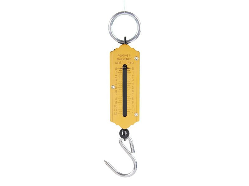 Portable spring scale for the field for fishermen, hunters, gardeners, etc. Maximum load: 12.5 kg.