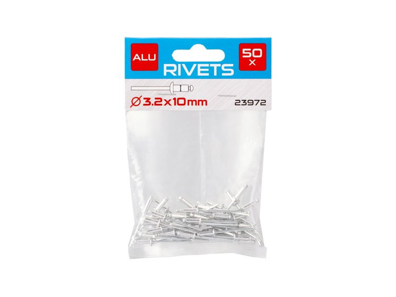 Klasszikus redőny-alumínium szegecsek, átmérő 3,2 mm, hossza 10 mm, 50 db-os kis kiszerelésben, kisfogyasztóknak megfelelő.