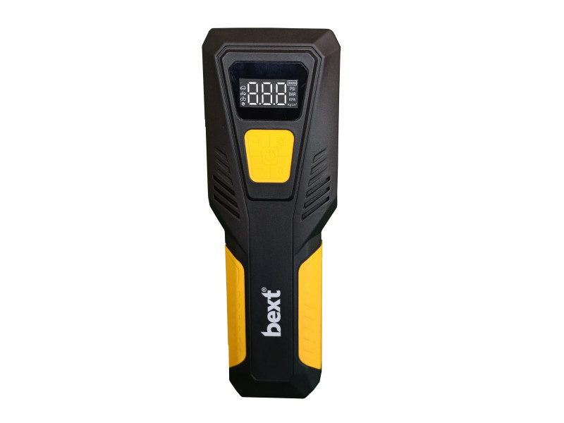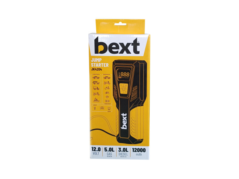 A BEXT JF4204 Jump starter egy LCD kijelzővel ellátott, többfunkciós eszköz: gyorsindító, kompresszor (10 bar), powerbank (12 Ah), zseblámpa és vészvillogó, ablaküvegtörő kalapács.