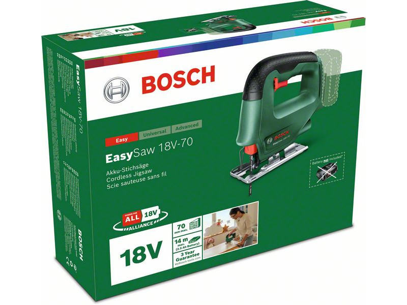 Egyszerű és megbízható, a kompakt EasySaw 18V-70 a megbízható választás beltéri barkácsfeladatokhoz és kreatív projektekhez. Ez a mindössze egy gombbal könnyedén működtethető könnyű szúrófűrész egyenes és ívelt vágásokra képes 70 mm mélységig faanyagban, például fa polcokban vagy laminált padlóban, illetve 6 mm mélységig fémben. További kényelmet jelent a lágy indítást és finom sebességbeállítást biztosító sebességszabályozó gomb. A vágási pontosság biztosításához a fűrészelés vonala a fűrészport eltávolító speciális fúvó funkciónak köszönhetően mindig tiszta marad. A fűrészlap könnyű kioldását beépített SDS rendszer garantálja. Ez a szerszám a POWER FOR ALL ALLIANCE rendszer része. Egyetlen akkumulátorral nagyszámú, különböző márkájú szerszám működtethető.