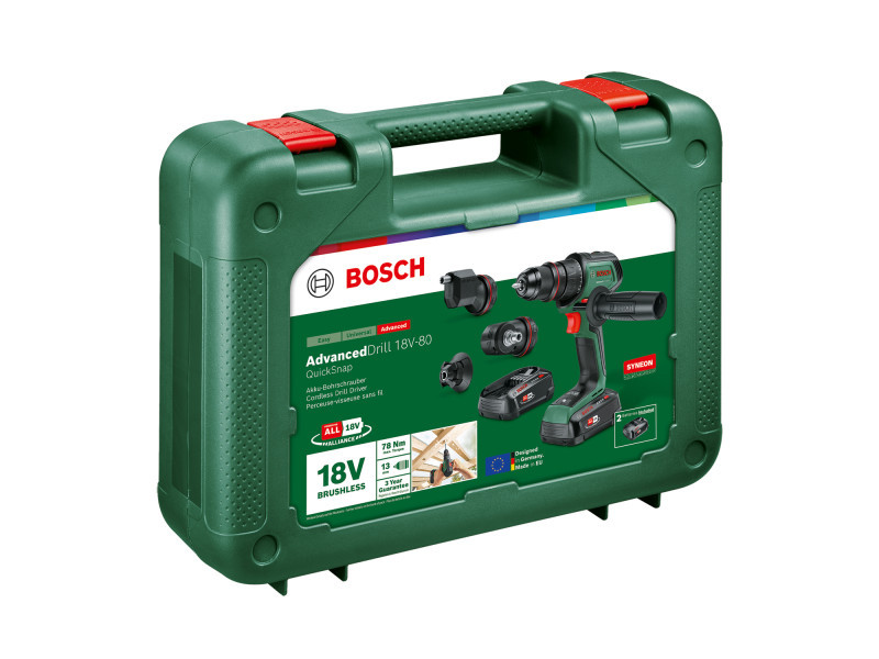 Szállítva: 2 db PBA 18V 2.5Ah akkumulátor, AL 18V-44 töltő, Csavarbehajtó bit, Cserélhető fémtokmány, Excenteradapter, Mágneses dugó, Pótfogantyú, Sarokadapter, Szállítókoffer