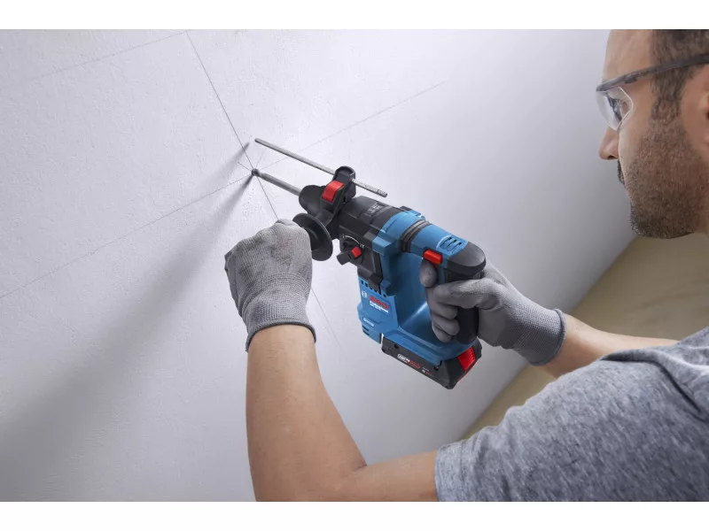 A Bosch GBH 18V-18 Professional fúrókalapács ideális olyan szakemberek számára, mint a bútorszerelők, asztalosok, üvegesek és létesítménykezelők, akik betonnal, fával és fémmel dolgoznak. Ez a legkönnyebb Bosch Professional akkus fúrókalapács a 18 V-os kínálatban, amely egy mindössze 18 V-os, 2,0 Ah-s akkumulátorral is maximális teljesítményt nyújt.