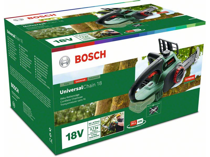 A UniversalChain 18 könnyű, kompakt és jól irányítható a hatékony és irányítható metszésért – súlya akkumulátorral együtt mindössze 3 kg. A Bosch SDS rendszerrel egyszerűen, szerszám nélkül végezhetők el a beállítások. A stabilizáló késvédő markolófoggal garantálja a biztos tartást – így jobb irányíthatóság jellemző alámetszéskor, és ezzel minimálisra csökkenthető az ágak sérülése. Egyszerű váltás a különböző feladatok között, úgymint finom metszés, hulladékkezelés és tűzifakészítés. Ez a szerszám a POWER FOR ALL ALLIANCE rendszer része. Egyetlen akkumulátorral nagyszámú, különböző márkájú szerszám működtethető-