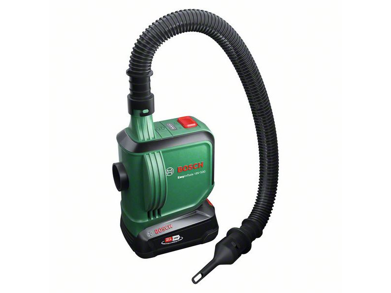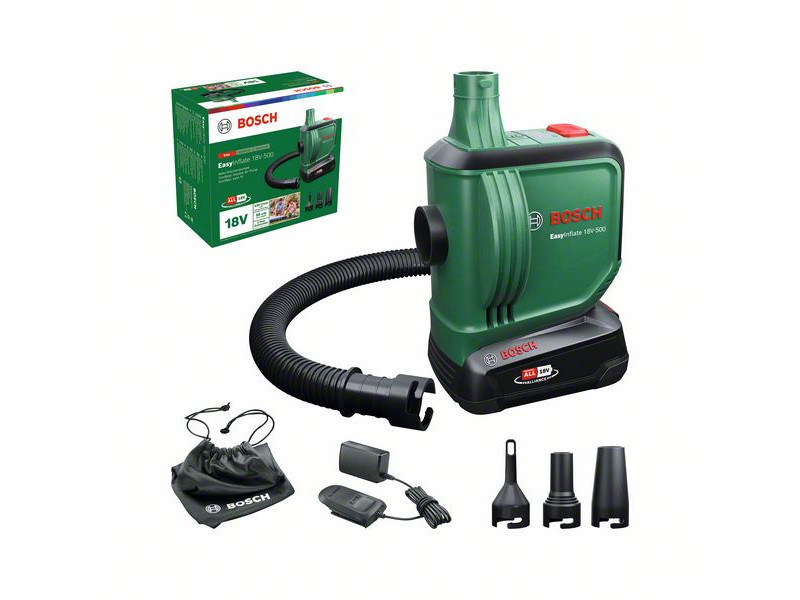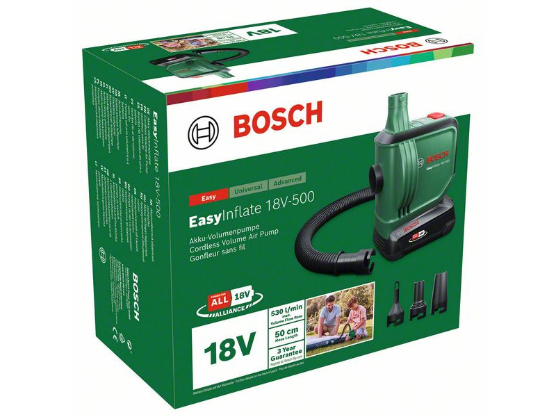 A Bosch EasyInflate 18V-500 akkus légpumpa 530 l/min maximális térfogatáramával a vízi játékok, felfújható csónakok, gumimatracok és más nagy térfogatú tárgyak felfújásának és leeresztésének sebességét új szintre emeli. Az 50 cm hosszú tömlő és az egyszerű be/ki kapcsoló kényelmes működtetést biztosít. A kompakt pumpához háromféle adapter van mellékelve a különböző méretű szelepekhez, és egy táska, amelyben minden egyszerűen elvihető a medencéhez, a tóhoz vagy a kempingezéshez. Ez a nagy térfogatokhoz alkalmas pumpa a 18V POWER FOR ALL ALLIANCE rendszer része. Egyetlen akkumulátor minden 18V POWER FOR ALL szerszámhoz.