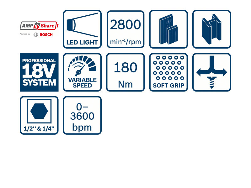 Összecsavarozás, csavarbehajtás és fúrás egyetlen szerszámmal: 1/4"-os hatlapú bittartóval csavarbehajtáshoz és fúráshoz, valamint 1/2"-os négyszög szerszámbefogóval összecsavarozáshoz.