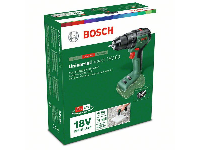 Több projekt fáradságmentes végrehajtása lenyűgöző fúrásteljesítménnyel és kitartással: ez a UniversalImpact 18V-60. Ez a könnyű, univerzális szerszám 20 fokozatú nyomatékállítási lehetőséggel, 2 sebességfokozattal és ütvefúrás üzemmóddal még nagyobb rugalmasságot, ugyanakkor ellenőrzött használatot biztosít. Ennek a szerszámnak az intenzív teljesítménye mögött a Bosch szénkefe nélküli motortechnológiája áll: a csavarokat fennakadásmentesen és gyorsan behajtja, a fúrószárat pedig a faalapú panelekbe, fémbe és falazatba juttatja, kényelmesen. A munkások értékelni fogják a robusztus 13 mm-es tokmányt, amely fémből készült, hogy a betétszerszámokat és csavarokat biztonságosan a helyén tartsa. Ez a szerszám a POWER FOR ALL ALLIANCE rendszer része. Egyetlen akkumulátorral nagyszámú, különböző márkájú szerszám működtethető.