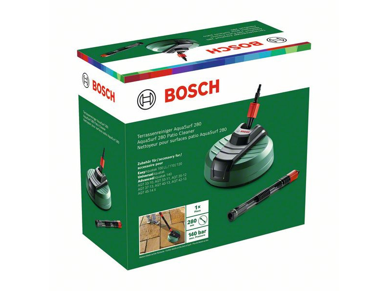 Az AquaSurf 280 terasztisztító hatékonyan megtisztítja a nagy gépkocsibejárókat és teraszokat. Könnyedén köröz a padlón, és egy szempillantás alatt eltávolítja az algát, a zuzmót és a mohát. Emellett a 280 mm-es átmérő kiemelkedően hatékony a nagy felületeken végzett gyors munkához. A kefe szegőcsíkja megakadályozza a víz kifröccsenését, így szárazon tartja a környezetet, míg a továbbfejlesztett fúvókák a legjobb tisztítási eredményt nyújtják. Könnyedén halad kövön, téglán, fapadlón, a rögzítőmechanizmus pedig gondoskodik a lándzsa merevségéről – a legnehezebb tisztítási feladatok elvégzéséhez-