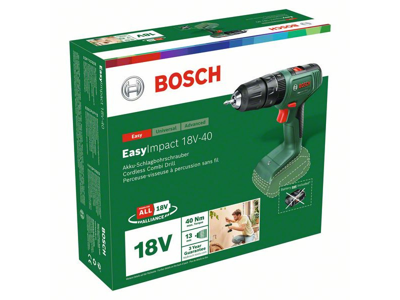 Az akkus EasyImpact 18V-40 kombinált fúró sokoldalú univerzális szerszám számos fúrási és rögzítési feladathoz. A 2 sebességfokozat gyors fúrást és erőteljes csavarozást tesz lehetővé, míg a 20 nyomatékszinttel maximális pontosság érhető el csavarbehajtáskor. A 13 mm-es egyhüvelyes tokmánnyal egyszerűen cserélhetők a fúrószárak és bitek. Az ergonomikus kialakításnak és a beépített LED-eknek köszönhetően a munka hatékonyan és kényelmesen végezhető még a rossz megvilágítású helyeken is. Egyértelműen jó választás fával, fémmel, műanyaggal és falazatban végzendő munkákhoz. Ez a szerszám a POWER FOR ALL ALLIANCE rendszer része. Egyetlen akkumulátorral nagyszámú, különböző márkájú szerszám működtethető.