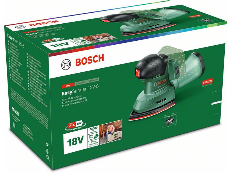 A nagy teljesítményű, akkumulátoros EasySander 18V-8 tökéletes egy sor projekthez. Multifunkcionális, a sarkokban, széleken és közepes sík felületeken akadálytalanul végzett munkákhoz tervezve. A csiszolópapír gyors és egyszerű cseréje a tépőzáras rögzítőrendszerrel. Ez a szerszám tökéletes keményfához, puhafához, fényezett és festett felületekhez, bútorok, ajtók stb. befejezéséhez. A könnyen levehető mikroszűrős porgyűjtődoboz csökkenti a por mennyiségét, így tisztább munkaterületet biztosít. A beépített Bosch Syneon technológia optimális teljesítményt biztosít maximális üzemidő mellett. Ez a szerszám a 18V POWER FOR ALL ALLIANCE rendszer része. Egyetlen akkumulátor minden 18V POWER FOR ALL szerszámhoz.