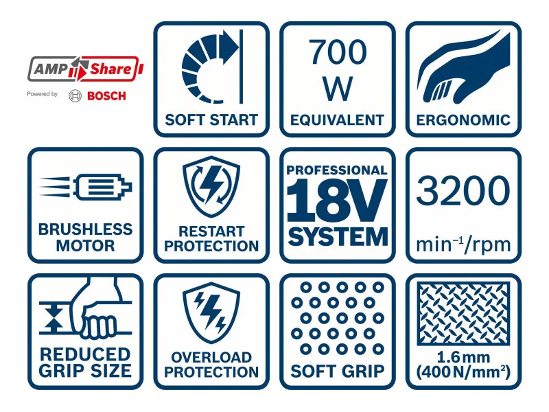 Erőteljes, egy 700 W-os vezetékes szerszáméval egyenértékű vágási teljesítmény fémben, a rendkívül hatékony szénkefe nélküli motortechnológiának köszönhetően.