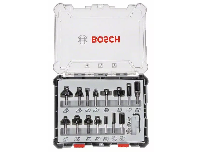 A készlet három változatban kapható: 6 mm, 8 mm vagy ¼ hüvelyk átmérőjű befogószárral, így használható a forgalomban levő összes kézi alakmaróval