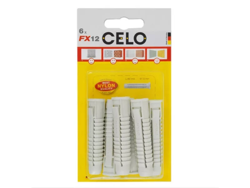 A népszerű CELO FX dübel négyirányú tágulása nagyon magas terhelhetőségi értékeket biztosít a különféle építőanyagokban. Bordázata megakadályozza az elforgást a furatban. A fejrészen levő gallérnak köszönhetően nem csúszik be a furatba. Az FX dübel kiváló minőségű, öregedésálló nylonból készül. Különböző típusú csavarokkal használható, mint például fa-, forgácslap-, önmetsző csavarok, stb. -40 °C és +80 °C között hőálló. Az FX dübel széles körű felhasználhatóságot tesz lehetővé.