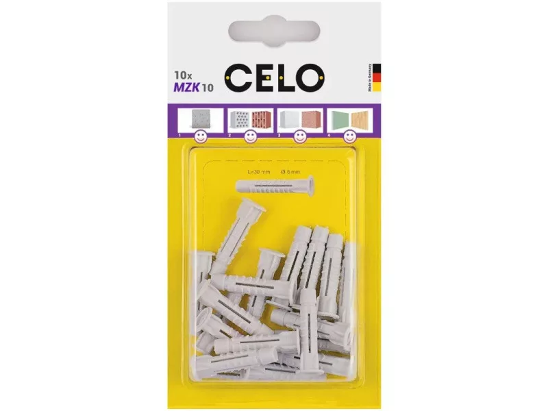 A CELO MZK univerzális galléros dübel milliószor bizonyította kiválóságát és szinte az összes építőanyagban használható. A dübel 4 irányú tágulása a tömör anyagokban és csomózó effektusa üreges építőanyagokban és gipszkartonban, mindig megfelelő rögzítést biztosít magas terhelhetőséggel. A gallér megakadályozza a dübel furatba csúszását. Kompatibilis különböző típusú és méretű csavarokkal. Kiváló minőségű polietilént tartalmaz, amely garantálja az MZ univerzális dübel tartós rugalmasságát.
