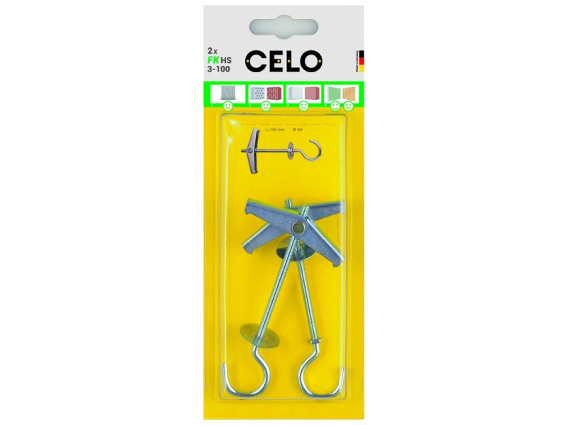 A CELO FK-S rugós dübel használható üreges- vagy álmennyezeteknél, gipszkarton, forgácslap, farostlemez táblákhoz. A rugós szárnyakat összenyomva tolja át a furaton. A tábla mögötti üres térben a szárnyak kinyílnak. Köszönhetően a hosszú menetes résznek különböző vastagságú lemezekhez használható.