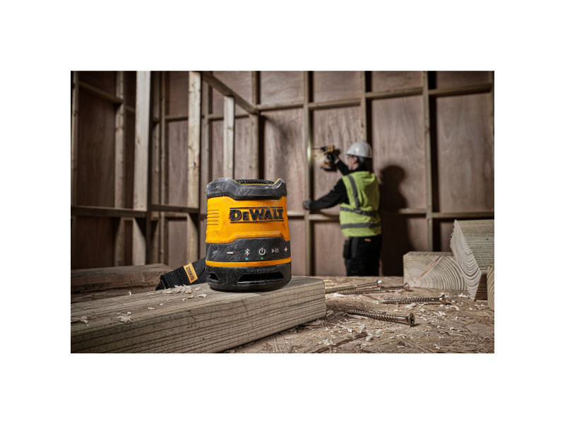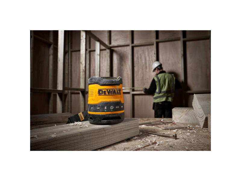 Tapasztalja meg az akár 16 órás üzemidőt a DEWALT DCR008 újratölthető mini Bluetooth hangszóróval. Ez a masszív hangszóró masszív házának, valamint a por- és vízvédelem IP67-es besorolásának köszönhetően strapabíró a munkahelyen. A hordszíj és csat kényelmes szállítást és tárolást tesz lehetővé