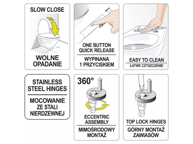 - a rögzítés excentrikus beállításának köszönhetően könnyen illeszkedik a legtöbb WC-csészébe, kompakt és falra szerelhető is lehet belőle