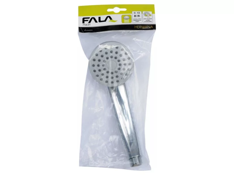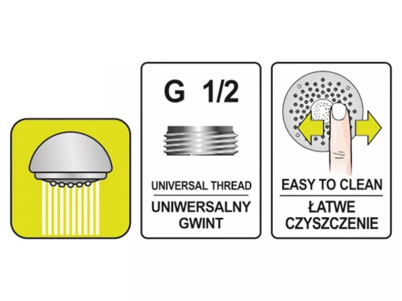 Klasszikus, egyfunkciós zuhanykabin, rugalmas fülekkel, amelyek segítenek eltávolítani a vízkőlerakódásokat. A szabványos 1/2"-os fúvókának köszönhetően illeszkedik a tipikus zuhanycsövekhez.