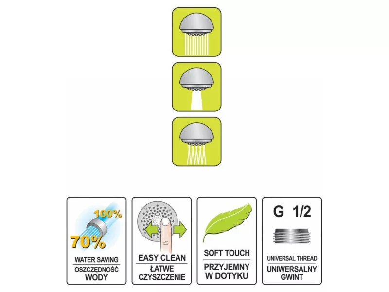 A szilikon fúvókáknak köszönhetően a vízkőlerakódások eltávolítása nem okoz gondot. A G1/2" csatlakozó átmérője bármely hagyományos zuhanycsőhöz illeszkedik.