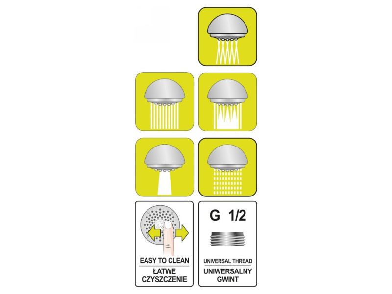 A zuhanykagyló a legújabb divatirányzatoknak megfelelően modern formájú. Tartós és masszívan készült. A beépített vízszabályozó megtakarítja a vízfogyasztást. A gumicsatornák megakadályozzák a vízkő felhalmozódását.