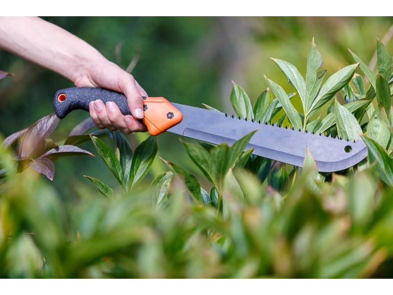 A machete ideális kisebb ágak, fák vagy rönkök eltávolítására, fakéreg lefejtésére és ágak levágására a törzsről, erdészetben és kertészetben. Túrázáshoz, horgászathoz, kempingezéshez stb. is használható. A csúszásmentes gumi fogantyú biztonságos fogást tesz lehetővé, elnyeli a használat okozta ütéseket, csökkenti a fáradtságot és lehetővé teszi a maximális ütési energia átvitelét a szerszám pengéjére. Edzett acélból, köszörült éllel. A machete a penge tetején van egy lyuk, így a falra akasztható. A felső szélén fogazott fűrésszel van felszerelve. Tépőzáras nylon tokot tartalmaz.