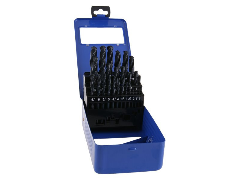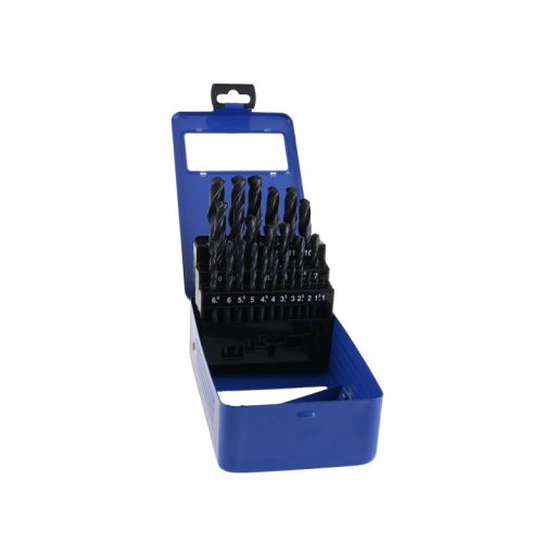 HSS fémfúró készlet, amely megfelel a DIN 338 szabványnak, a fúrók kiváló minőségű gyorsacélból (HSS), volfrám 4%, molibdén 3%, króm 4%, vanádium 1%. 25 db-os készletben, átmérő 1,0 - 13,0 mm.