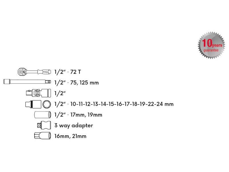 A kiváló minőségű gola készlet a felhasznált anyagok minősége és a professzionális autóműhelyben vagy szervizben történő feldolgozás miatt megfelelő. 10 év garancia. Minden alkatrész kiváló minőségű króm-vanádium acélból készül. Nikkel bevonat. A fúróhegyek S2 ötvözött acélból készültek. A racsnis 72 fogas finom felosztású, a racsnis teste CrV acélból, a fogszerkezet S2 acélból készült, a fogantyú pedig ergonomikus kialakítású, ártalmatlan gumival. Új kialakítású, elsődleges anyagból készült műanyag tok fém záródással és fedél zsanérokkal.