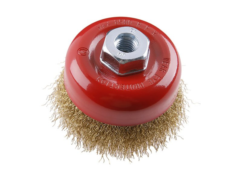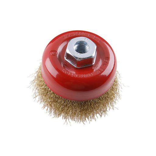 Forgókefe - csésze, FESTA kefék garantálják a minőségi felhasznált anyagokat és feldolgozást, hullámos huzal - sárgaréz bevonatú 0,3 mm, átmérő 100 mm, huzalok száma 2500, huzal hossza 26 mm, maximális fordulatszám percenként. 8500, szerelés M14*2mm, maximális fordulatszám percenként. 12500, rozsda eltávolítására alkalmas, festék, polírozás..., csomagolás: euro lyukkal papírdoboz.