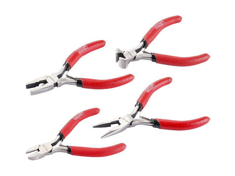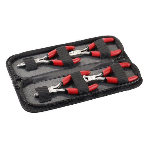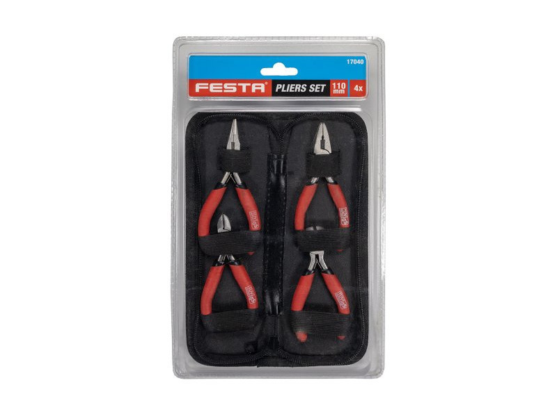 Mini fogó készlet (110mm) praktikus zárható tokban, a készlet tartalma: kombinált, rádiós, oldalsó és elülső vágófogó, gumírozott fogantyúk, kényes műhelymunkához.