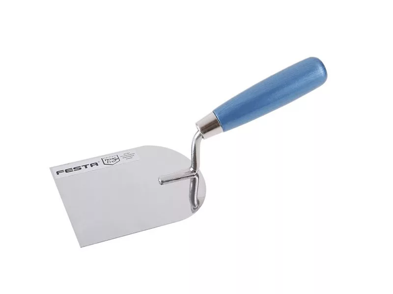 Radírozó kanál rozsdamentes acél FESTA 100 mm, fa nyéllel. Minőségi rozsdamentes acél. Az építőiparban befejező munkákhoz használják.