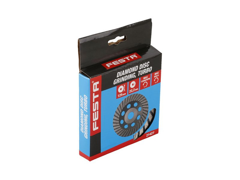 Csiszoló gyémánt tárcsa FESTA turbó, robusztus tartólemez tömör ötvözetből készült, speciális kialakítású gyémántszegmensek rögzítése a tárcsa hordozótárcsájához, magas gyémántpor tartalom a szegmensekben, felhasználás: márvány, gránit, tégla száraz csiszolásához , falazat, természetes és műkő, csempe , csempe..., lamellás kivitel finom csiszolásra alkalmas, méretek: a termék megnevezésében feltüntetve, csomagolás: papírdoboz eurolyukkal.