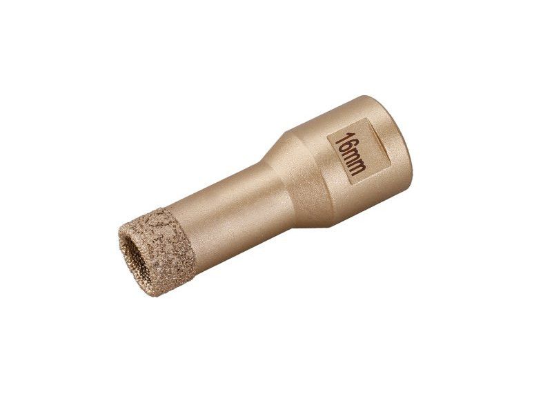 • javasolt munkamenet - csavarja fel a koronát közvetlenül a szög menetére köszörűfej, húzza meg erősen, 45°-os szögben körbe kell indítani a kívánt furatot, a korona és a daráló sebessége azonnal biztosítja a rögzítést a kívánt helyre, lassan egyenesítse ki a lekerekítés irányát függőleges helyzetbe, egyenletes nyomással.A kisebb, 6-14 mm-es átmérők kemény burkolatok fúrására szolgálnak. HŰTÉS az egyes fúrások között – csak merítse egy pohár vízbe, vagy forgás közben hagyja kihűlni a levegőn!