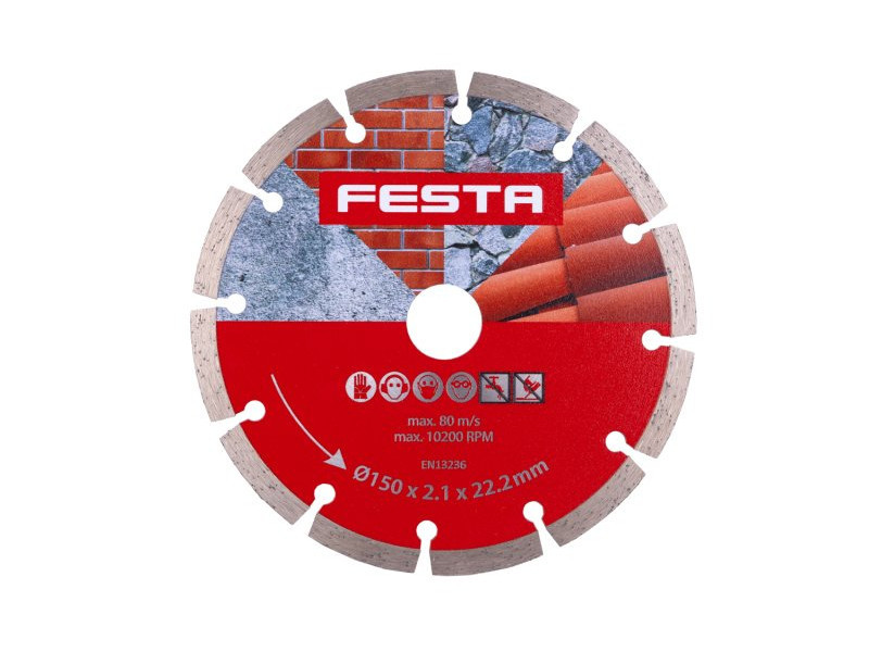 FESTA professzionális gyémántpenge, kialakítás: SZEGMENTES, kiváló minőségű anyagok és megmunkálás - a gyémánt szegmensek nagy szilárdságú rögzítése a penge tartótárcsájához, magas gyémántpor tartalom a szegmensekben, felhasználás: beton, tégla száraz vágásához , falazat, kő, ..., csomagolás: eurólyukkal ellátott buborékfólia, méretek: a termék megnevezésében szerepel.