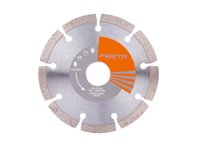FESTA professzionális gyémántpenge, kialakítás: SZEGMENTES, kiváló minőségű anyagok és megmunkálás - a gyémánt szegmensek nagy szilárdságú rögzítése a penge tartótárcsájához, magas gyémántpor tartalom a szegmensekben, felhasználás: beton, tégla száraz vágásához , falazat, kő, ..., csomagolás: eurólyukkal ellátott buborékfólia, méretek: a termék megnevezésében szerepel.