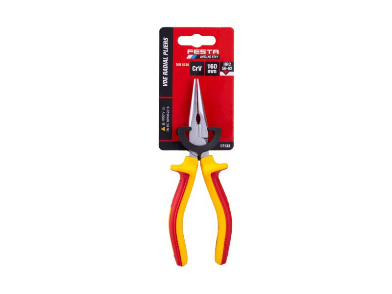 A 160 mm-es FESTA VDE rádiófogók elektro VDE 1000 V, IEC/EN 60900-2004 tanúsítvánnyal rendelkeznek, az ergonomikusan kialakított nyélen a polipropilén és a gumi kombinációja kiváló csúszásgátló tulajdonságokat és jó kenőanyagokkal és vegyszerekkel szembeni ellenállást garantál. Megfogópofák különösen kopásálló, króm-vanádium nagy teljesítményű acélból. Súlya 0,233 kg.