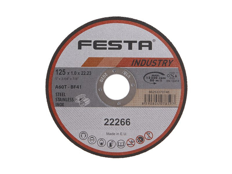 Professzionális vágótárcsa fémhez, öntöttvashoz, ROZSDAMENTES ACÉLHOZ, EURÓPÁBAN A FESTA INDUSTRY tárcsacsalád a nevéből adódóan kifejezetten professzionális használatra készült, a minőséget valódi, a vágások számát és sebességét vizsgáló tesztek igazolják. Szemcsetípus - KORUND, kötőanyag - aldehid alapú műgyanták, kivitel - EGYENES, max. fordulatszám - 80 m/s, megengedett fordulatszám - 12200 ford./perc, ERŐSÍTÉSRE KETTŐRÉTEGŰ ÜVEGVEL! A FESTA INDUSTRY TÁRCSAI MEGFELELnek az EN 12413-nak és az OSA homologizációnak!