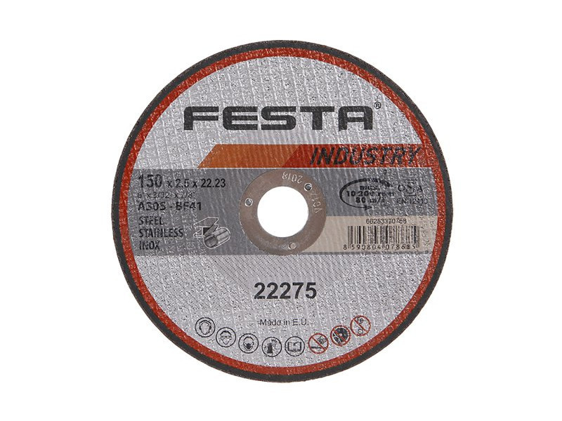 Professzionális vágótárcsa fémhez, öntöttvashoz, ROZSDAMENTES ACÉLHOZ. Az EURÓPÁBAN gyártott FESTA INDUSTRY tárcsacsalád, ahogy a név is sugallja, kifejezetten professzionális használatra készült, a minőséget valódi, a vágásszámra és sebességre összpontosító tesztekkel igazolják. Szemcsetípus - KORUND, kötőanyag - aldehid alapú műgyanták, kivitel - EGYENES, max. fordulatszám - 80 m/s, megengedett fordulatszám - 12200 ford./perc, ERŐSÍTÉSRE KETTŐRÉTEGŰ ÜVEGVEL! A FESTA INDUSTRY TÁRCSAI MEGFELELnek az EN 12413-nak és az OSA homologizációnak!