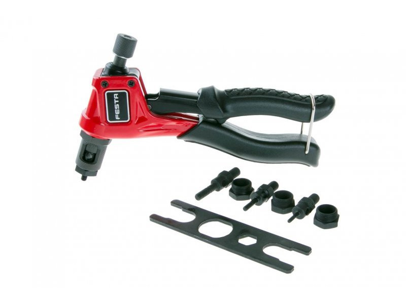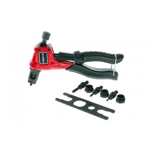 Professzionális szegecselő fogó szegecsanyákhoz / anyaszegecsekhez. Hossza 200 mm. M3, M4, M5, M6 anyákhoz, anyagokból: alumínium, sárgaréz, acél és rozsdamentes acél. 4 db szegecsadapter jár hozzá. A fogó Cr-Mo anyagból, szénacélból és PVC-ből készül. Egy szegecsanyával szegecselt csatlakozásban sértetlen menet jön létre, amelyhez könnyen csatlakoztathat más alkatrészeket.