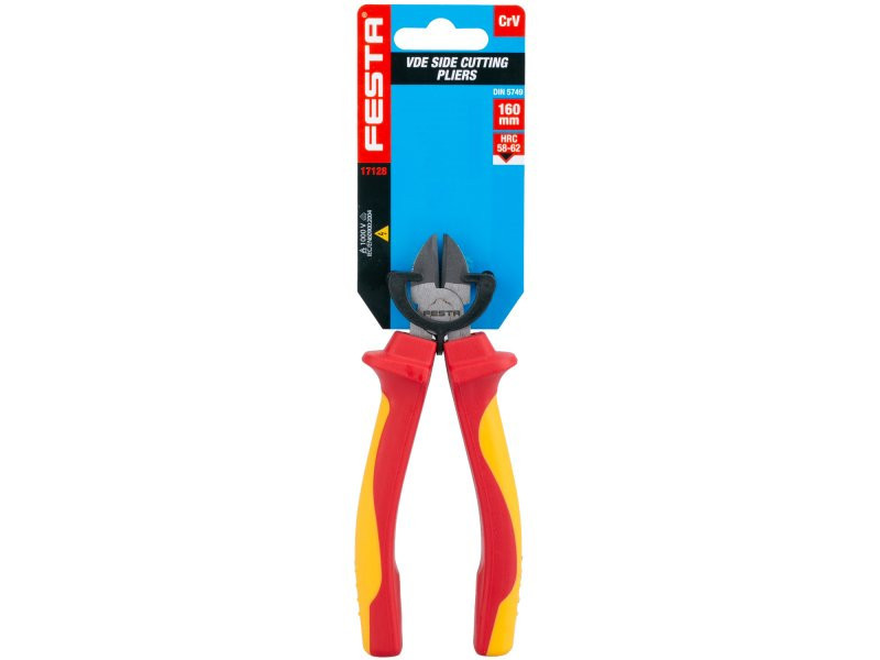 A FESTA VDE 160 mm-es oldalhasító fogók elektro VDE 1000 V, IEC/EN 60900-2004 tanúsítvánnyal rendelkeznek, a polipropilén és a gumi kombinációja az ergonomikusan kialakított fogantyúkon kiváló csúszásgátló tulajdonságokat és jó kenőanyagokkal és vegyszerekkel szembeni ellenállást garantál. Megfogópofák különösen kopásálló, króm-vanádium nagy teljesítményű acélból. Súlya 0,283 kg.