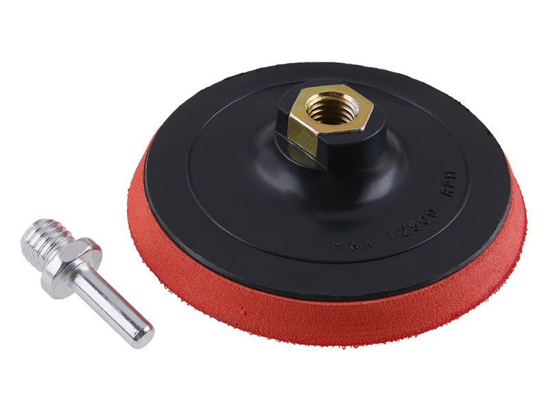 Csiszolópapír meghajtó, rugalmas tartólap, puha elasztikus EVA hab, nagyon jól alkalmazkodik a csiszolt felülethez, menet: M14, szár - redukció M 14 / 8mm, felhasználás: 115 mm átmérőjű csiszolóvágás rögzítésére, rögzítés módja: tépőzár , csomagolás: buborékfólia euro lyukkal.