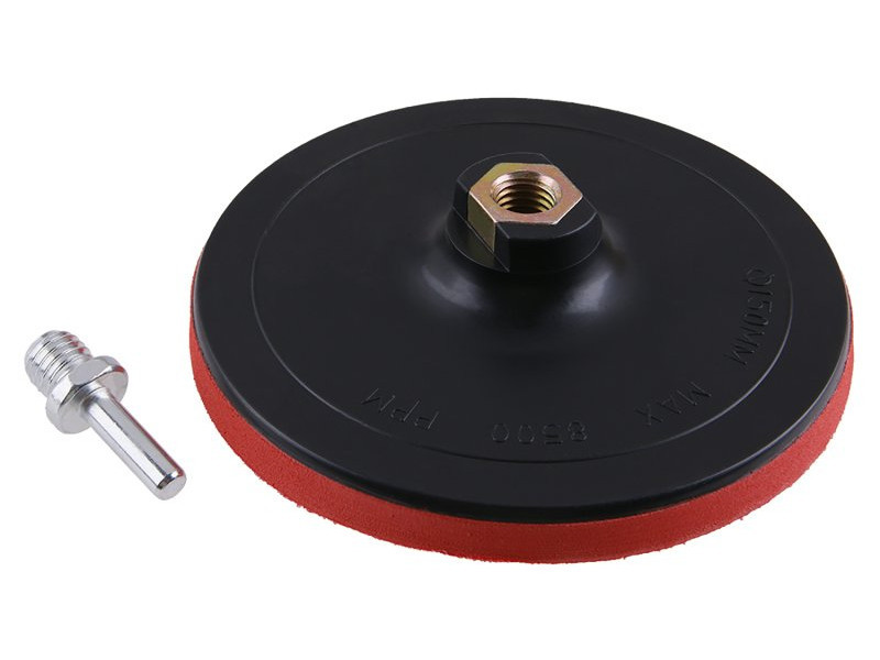 Csiszolópapír meghajtó, flexibilis tartólap, puha elasztikus EVA hab, nagyon jól illeszkedik a csiszolt felülethez, menet: M14, szár - redukció M 14 / 8mm, felhasználás: 150 mm átmérőjű csiszolódarabok rögzítésére, rögzítés módja: tépőzár , csomagolás: buborékfólia euro lyukkal.