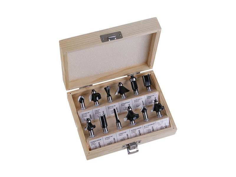 Formavágók fához - 12 db-os készlet, a marók kiváló minőségű SK pengével, különböző típusú vezetőkerék nélküli vagy vezetőkerék nélküli formavágókkal és kiváló minőségű csapággyal vannak felszerelve, felhasználás: különböző formájú hornyok és élek marásához, szár 8 mm, csomagolás: Fa doboz.