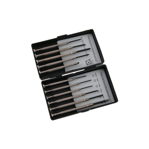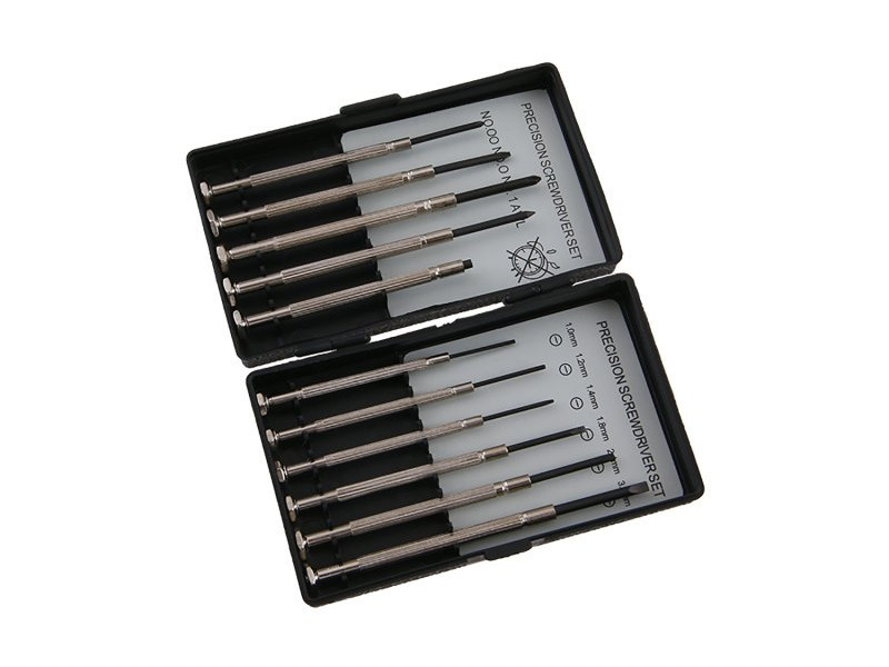 A leggyakrabban használt hegyformájú és méretű csavarhúzó készlet finommechanikai és optikákhoz (lapos 11,21,41,82,4 3 + PH00, PH0, PH1). Hobbi használatra.
