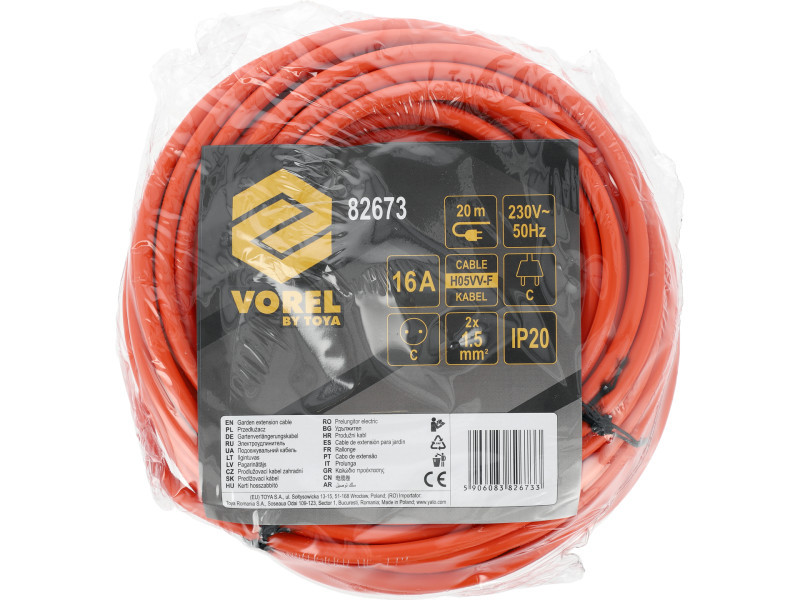 20 m hosszú, egy aljzatú hosszabbító kábel vastag narancssárga szigeteléssel. Hasznos otthon és a garázsban. A csatlakoztatandó készülék maximális teljesítménye: 1380 W.