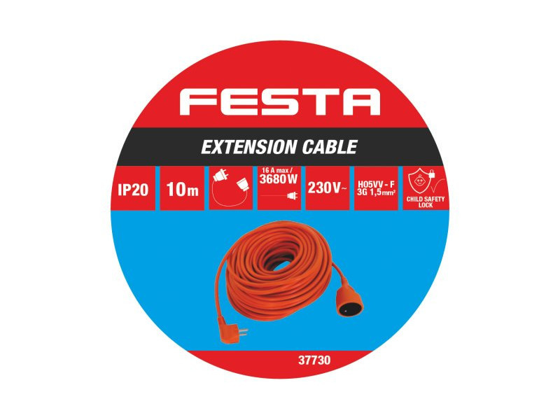 Hosszabbító kábel, kábelhossz 10m, tápkábel 1,5mm2, 16A/230V, max 3680W. Gyerekzáras konnektorok.