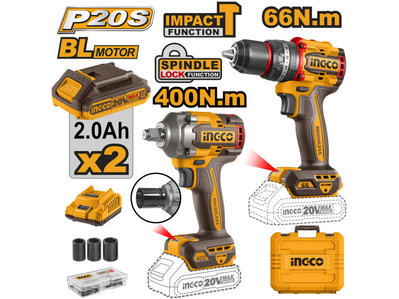 INGCO Akkus erőcsomag 20 V Ütvefúró-csavarozó 66 Nm+Ütvecsavarozó 1/2" 405 Nm (2 db akku + töltő)