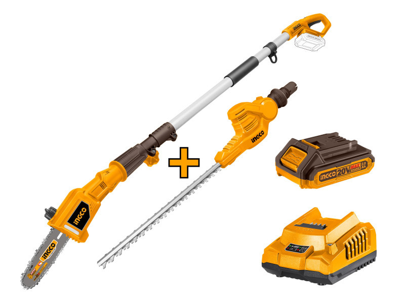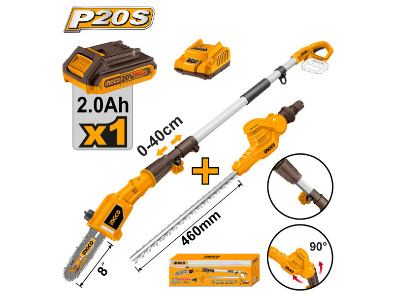 INGCO Akkus magassági sövény 460 mm és ágvágó 200 mm 0-400 mm 20 V (1 x 2,0 Ah akku + töltő)