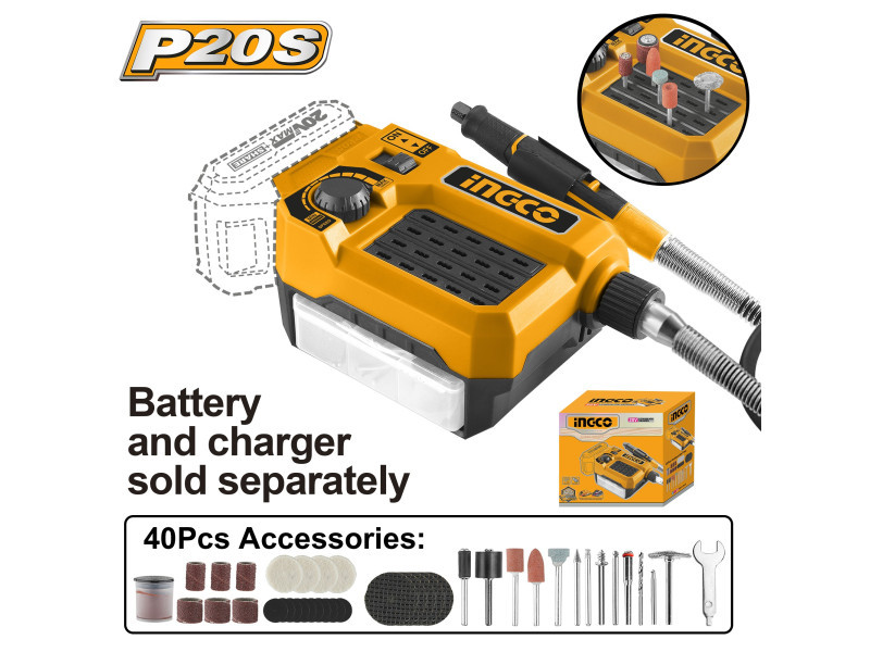 Szállítási terjedelem: Akkumulátor és töltő nélkül, 1 db flexibilis hosszabbító, 40 db tartozék, 1 szett szénkefe, Kartondobozban