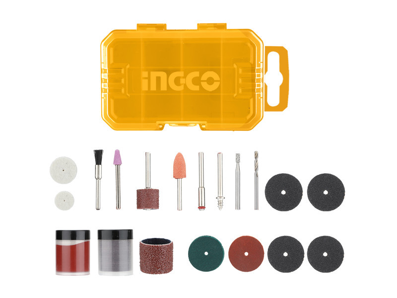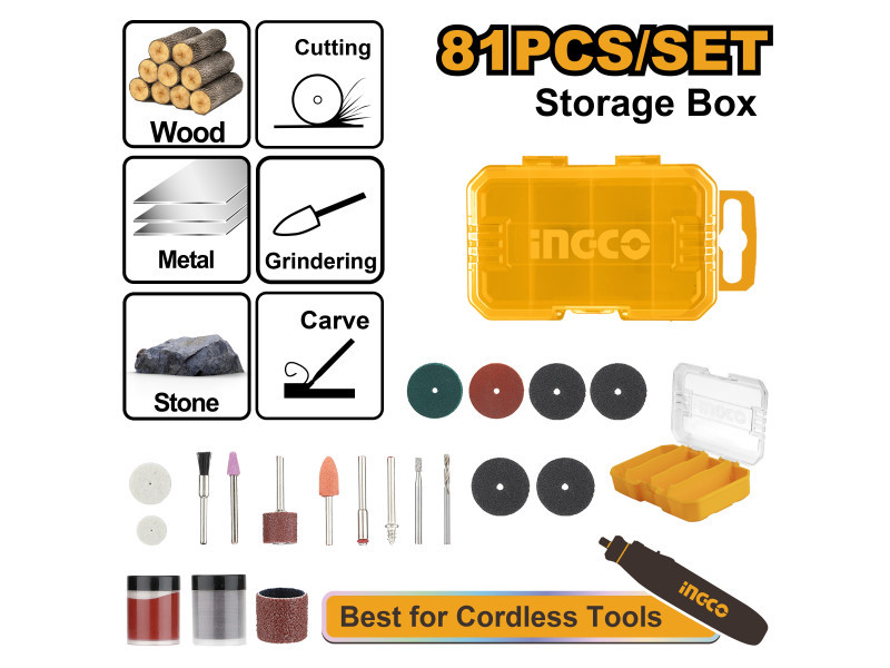 Befogószár mérete: 3,2 mm (1/8"), 81 darabos általános célú készlet: 4 db csiszolószalag, 2 db csiszolókő, 1 db nylon kefe, 1 db fúrószár, 2 db befogó szár (mandrel), 2 db impregnált korong, 1 db nagysebességű vágófej, 2 db polírozó korong, 3 db megerősített vágókorong, 1 db polírozó anyag, 36 db vágókorong, 25 db csiszolótárcsa, 1 db csiszolódob befogószárral, Kartondobozban