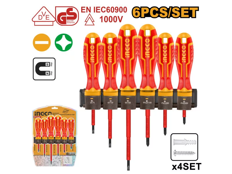Szállítási terjedelem: 6 db szigetelt csavarhúzó, Alumínium tartó, 4 db csavar, 4 db tipli, bliszterben