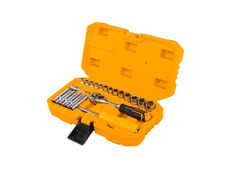 Szállítási terjedelem: 1 db 1/4" racsnis hajtószár, 13 db 1/4" dugókulcs, 4 db 1/4" hosszú dugókulcs, 1 db 1/4" toldószár, 1 db 1/4" behajtószár nyéllelt, Kofferben
